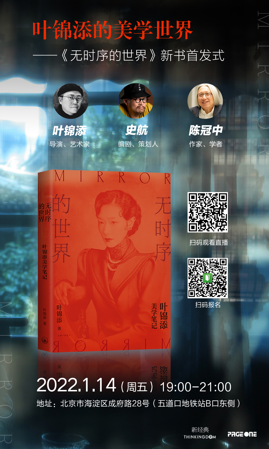 1月14日晚,叶锦添将携全新艺术随笔集《无时序的世界》与编剧史航、学者陈冠中一同做客PAGEONE五道口店,畅谈他们的艺术主张,分享他们对富有东方诗意的艺术世界的理解,以及与读者朋友们,一起思考和讨论服装、舞台、电影美术、视觉艺术、当代艺术创作等多元领域的美学观点与实践层面的探索。