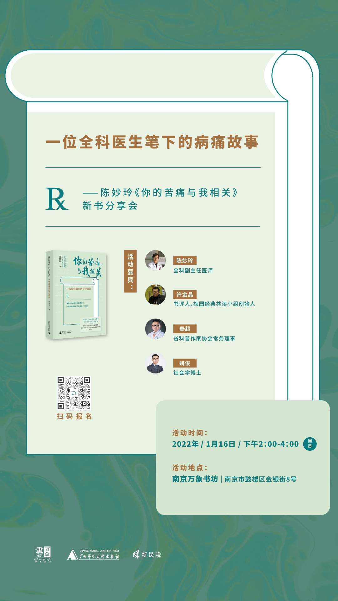 南京|一位全科医生笔下的病痛故事——陈妙玲《你的苦痛与我相关》新书分享会