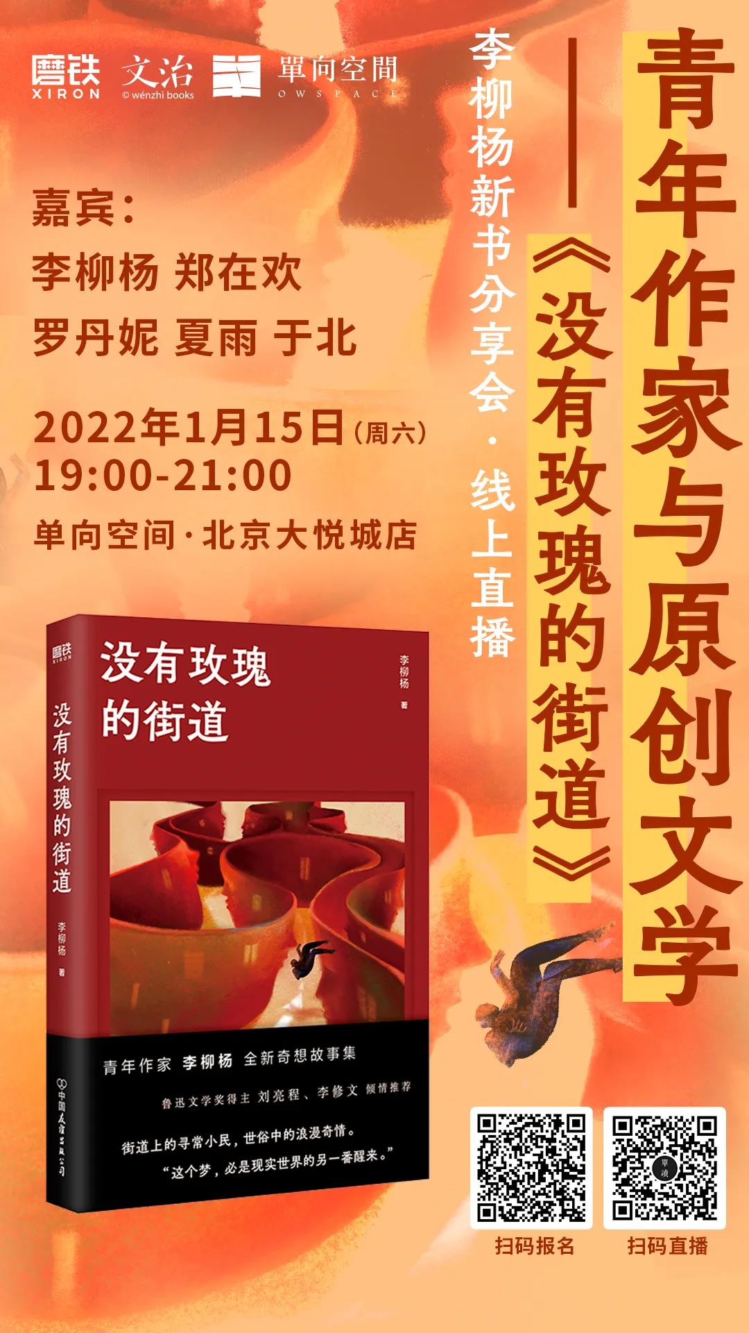 提到青年作家与原创文学,你会想到哪些人和作品?而他们的写作、出版,甚至阅读,经历了一个怎样的过程?抱着这个疑问,同时在青年作家李柳杨全新小说集《没有玫瑰的街道》出版之际,1月15日晚,在单向空间·大悦城店,听青年作家李柳杨和郑在欢、罗丹妮、夏雨、于北,一起聊一聊原创文学的写作与出版……