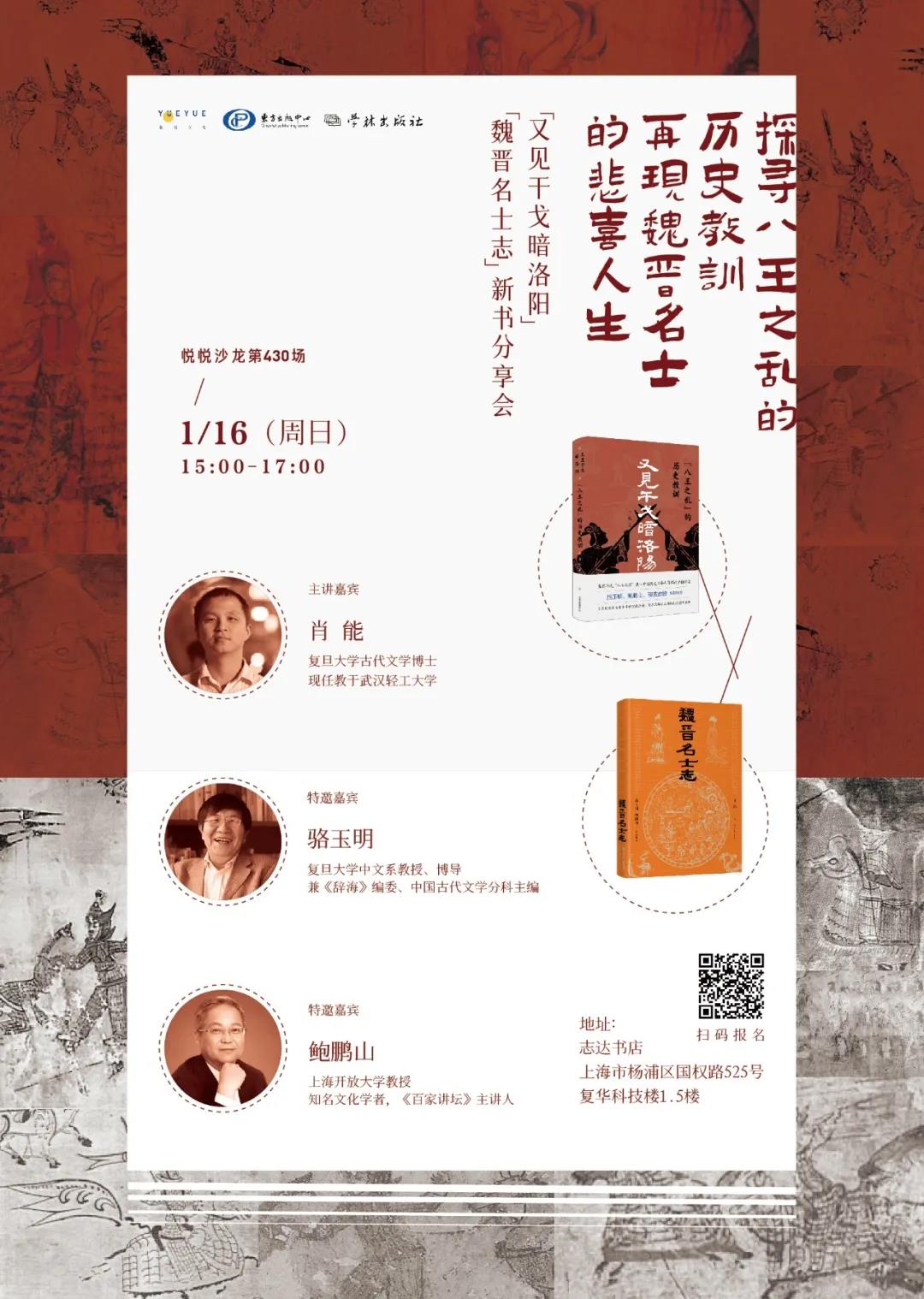 《又见干戈暗洛阳》真实再现了“八王之乱”这个中国历史上令人伤怀的至暗时刻,揭示了国家动荡之际人民的苦难与士人的哀屈,告诫人们历史的经验值得吸取,治乱的教训不可或忘。本周日,骆玉明、鲍鹏山两位学者,以及本书作者肖能将做客志达书店,再现“八王之乱”这一中国历史上令人伤怀的至暗时刻,多角度探寻王室争斗的波诡云谲,深层次解读王朝治乱的得失成败。