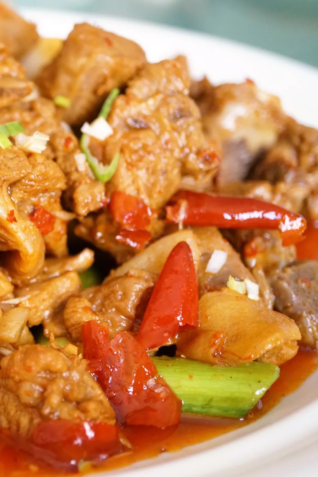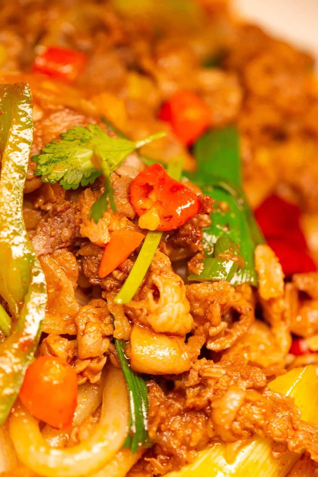 比如羊羔肉,最适合猛火爆炒,加辣椒,增香提色。增香,是切成块的干红辣椒,在火热的羊油中被逼出极致的香辣,完美去除肉质中隐约的腥膻;提色,是辣椒粉或羊油辣子,使汤汁更加红亮;最后上桌前加点青椒,补充一丝鲜辣。