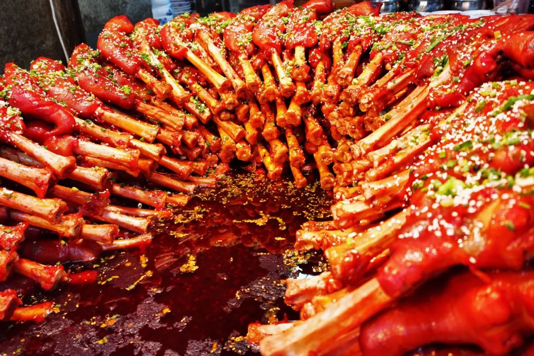 再比如辣爆凤爪,凤爪先用卤汤慢慢卤软再过油加辣,辣椒和卤汤的味道都能渗进凤爪的骨头里,软软糯糯,吃进嘴里不用啃,一抿就只剩骨头。