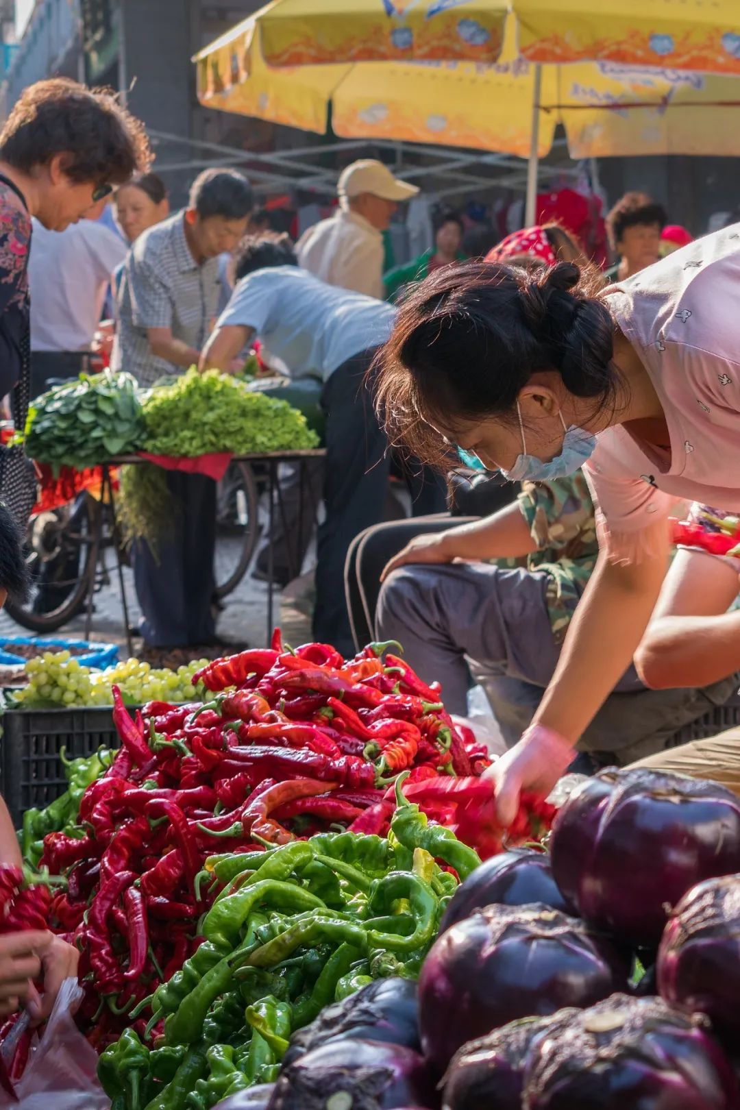 银川鼓楼早市上的青辣椒与红辣椒。摄影/孙伟