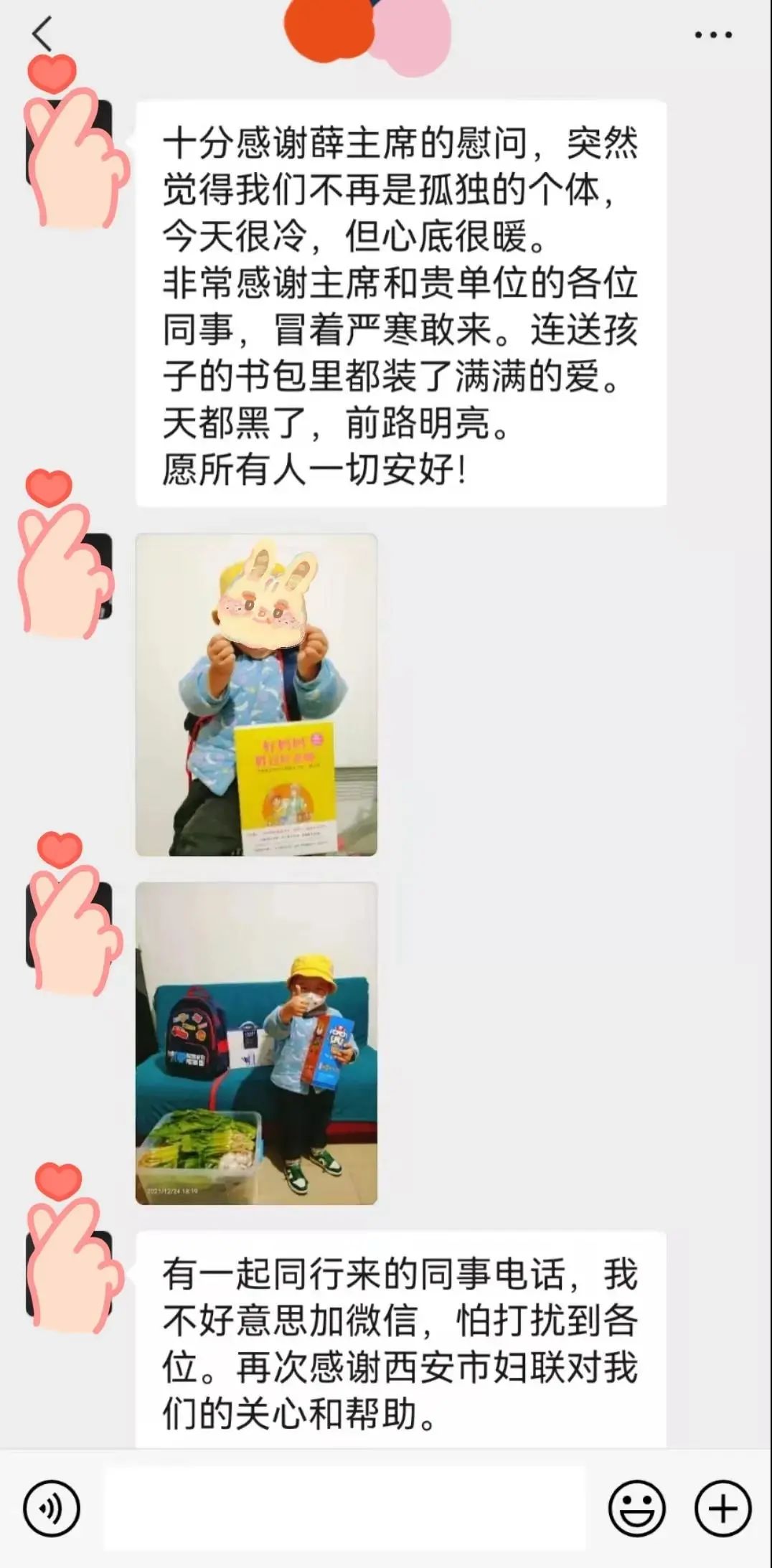 2021年12月24日,得知宝宝已经做完护理治疗返回家中,市妇联为宝宝购买了牛奶、书包、绘本等儿童用品,同时还带着蔬菜等生活物资前往家中看望慰问:“‘妇联妈妈’永远在身边,坚信小宝宝一定能够战胜病魔,健康快乐成长。” 宝妈眼含泪水激动地说:“十分感谢妇联同志的关心慰问,突然觉得我们不再是孤独的个体。今天天气虽然很冷,但心底却感到了妇联的温暖。你们冒着严寒来,连送孩子的书包都装了满满的爱,天虽黑了,但我们一家感到前路明亮。”