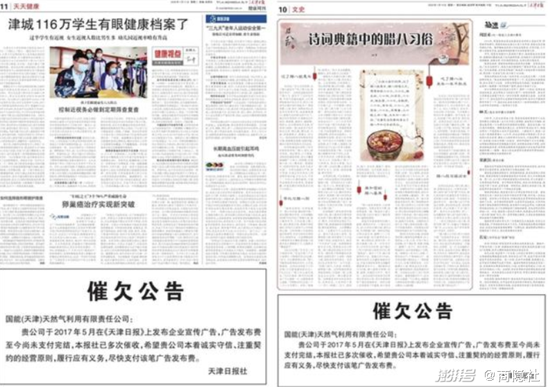 据红星新闻报道,《天津日报》在1月10日、11日连续两天发布同一则《催欠公告》:
