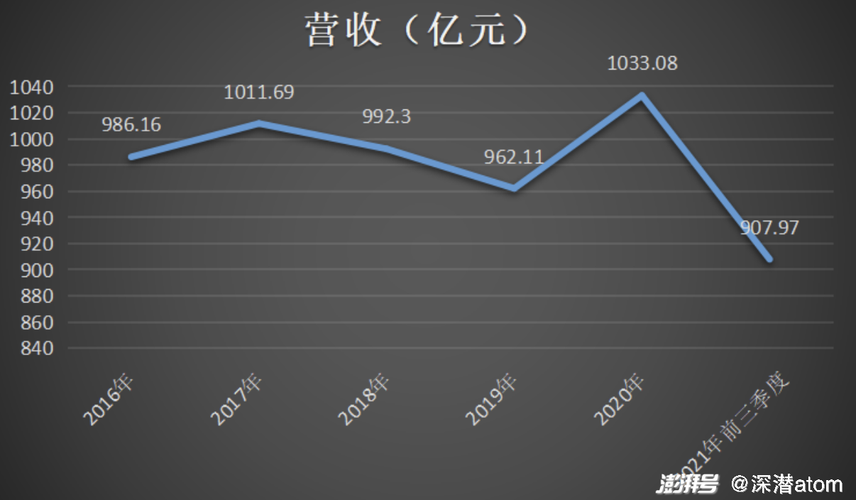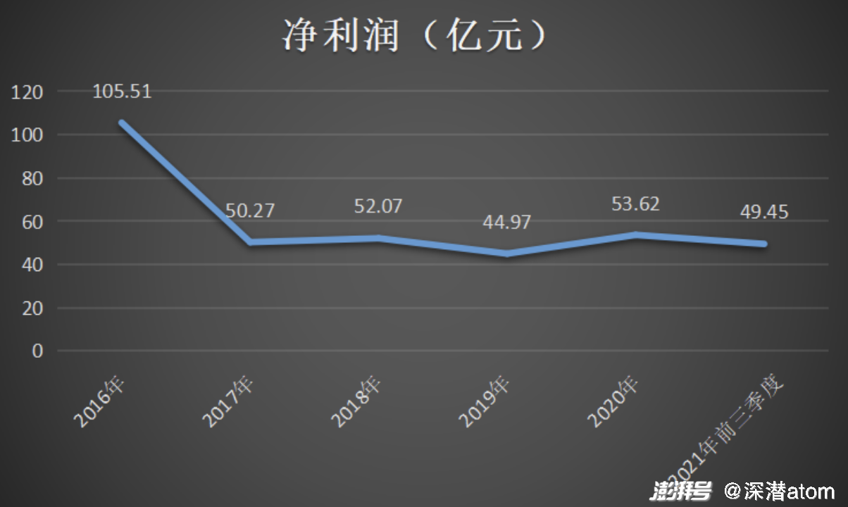 从营收端看,长城汽车过去六年营收基本无增长。2016年,2017年,2018年,2019年,2020年,2021年前三季度,公司营业收入分别为986.16亿元、1011.69亿元、992.30亿元、962.11亿元、1033.08亿元、907.97亿元、,增速分别为为29.70%、2.59%、-1.92%、-3.04%、7.38%、46.11%。