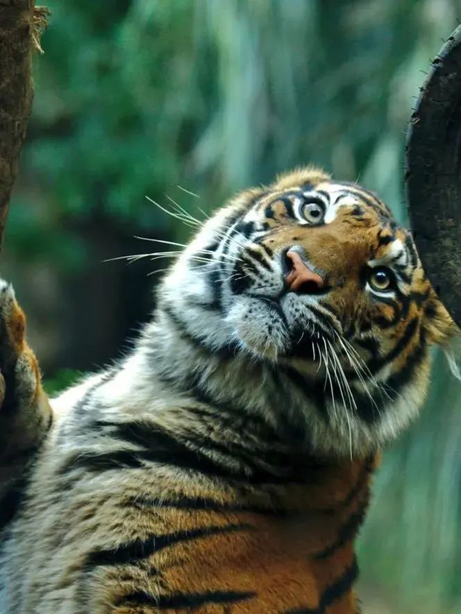 尽管你平时很难将丛林里威震四方的虎,跟沙发上伸着懒腰打着呼噜的猫联系在一起。但在基因序列上,虎与猫有高达95.6%的相似度。作为一只“猫”,爬树毕竟是基本技能。