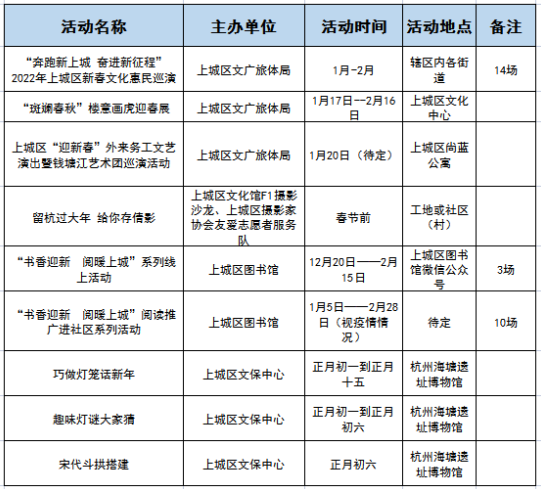 春节期间,上城区还将开展“文化送福 艺暖上城”2022年新春文化惠民巡演、“迎新春”外来务工文艺演出暨钱塘江艺术团巡演、“书香迎新 阅暖上城”系列活动、古钱宋韵展、虎年海塘邀您合家欢等近30项丰富多彩的迎新春体验活动,全面展示多元包容、百工竞巧、追求卓越、风雅精致的宋韵文化气象。