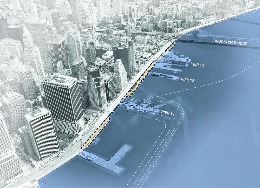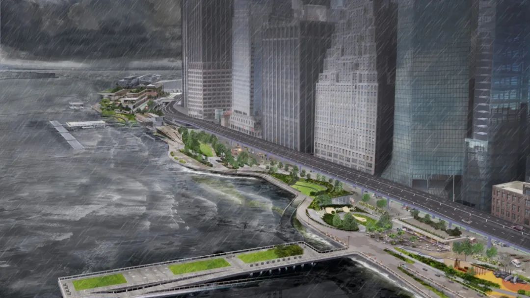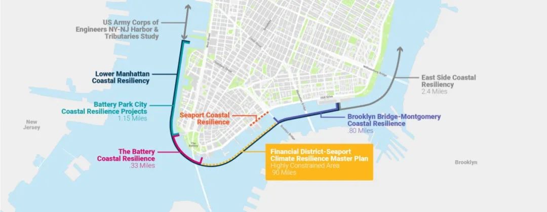 曼哈顿下城因其海岸线低平而格外脆弱,易受气候变化影响。早在2019年3月,纽约市就发布了《曼哈顿下城气候韧性研究》,这是一项综合全面的多灾种气候风险评估,逐一识别出该地区的脆弱性。基于该报告,曼哈顿下城70%海岸线有待实施气候适应和保护项目,并勾画出格外有挑战性的重点区段。金融区和海港片区首当其冲。