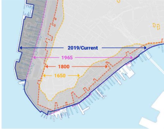 曼哈顿岛岸线的外推由来已久,图中可见1650、1800、1965和2019年岸线示意图。拟采用的设计方案,将防洪基础设施整合到一个新建的多层级公共海滨开放空间中,供所有人享用。最上层,高度足以抵御沿海风暴;埋设的防洪墙,兼作高架开放空间,可在此欣赏海港和城市的景观。新修一条滨海大道,与水相邻,连接码头和渡轮。滨海大道的高度应当充分,确保随着海平面上升也不至于被淹没,其设计应确保在沿海风暴期间遭遇洪水仍安全无虞。