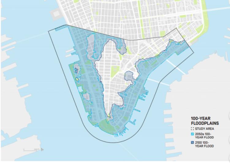 《金融区与海港气候韧性总体规划》是曼哈顿下城气候韧性提升行动的重要组成。气候变化对海岸地区的直接影响分为三类:涨潮、风暴和雨洪。无论是否采取行动,金融区和海港都会发生巨大变化。根据预测,如果不采取行动,2040年代,该区域将因涨潮而频频被淹没;2050年代,淹没事件将每月发生一次;2080年代,淹没事件每天出现;2100年,该地区大部分地区将被淹没,滨海大道水位比当前高出4英尺。风暴的影响则更为急遽,将导致多个街区受到洪水侵入,带来巨大损失,乃至让该地区的功能丧失殆尽。此外,气候变化影响不限于该区域或纽约市范围。飓风桑迪、911袭击以及过去因其他原因导致的曼哈顿下城停摆,即便只持续几天,也在全美乃至全球范围产生重大经济影响。