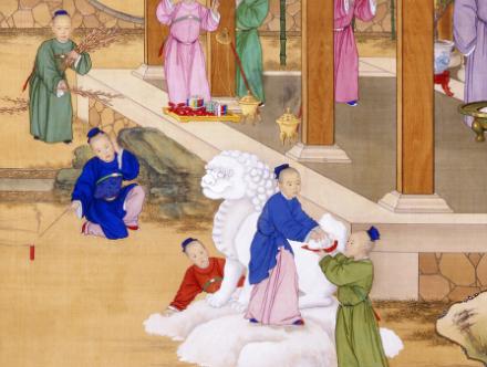 一图中也描绘了清廷冬季堆雪狮的场景,