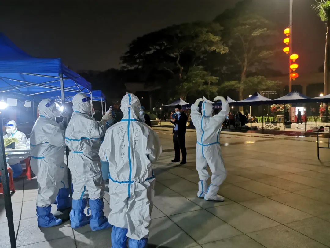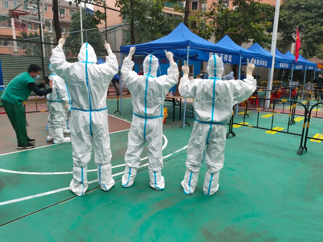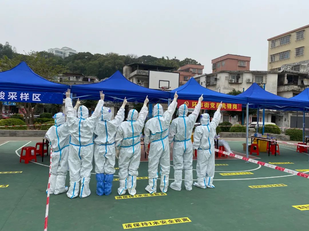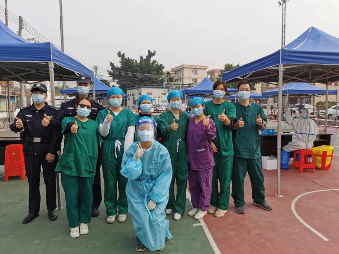 棠下镇莲塘村检测点在市五邑中医院与棠下医院强强联手下,提前完成检测任务,公安辅警为医护人员点赞!坚守岗位的最后一个“大白”也不甘寂寞,为提前完成任务比耶!