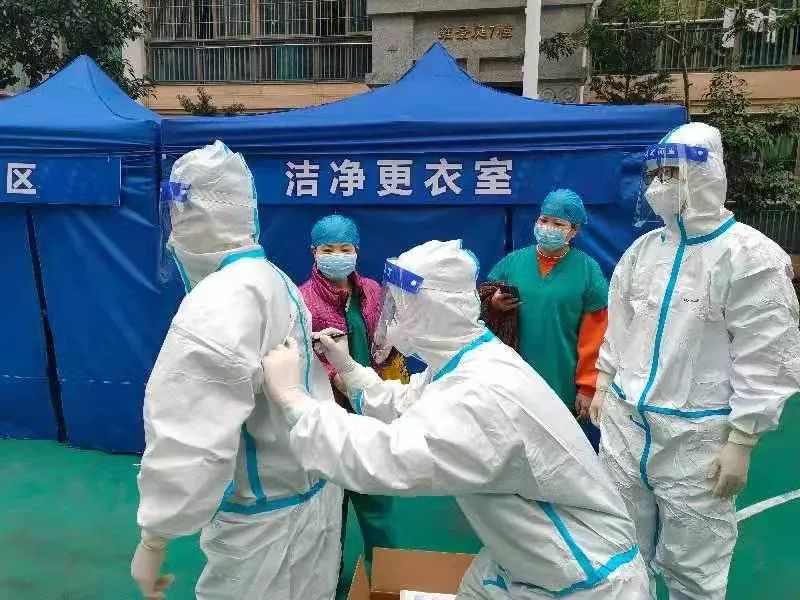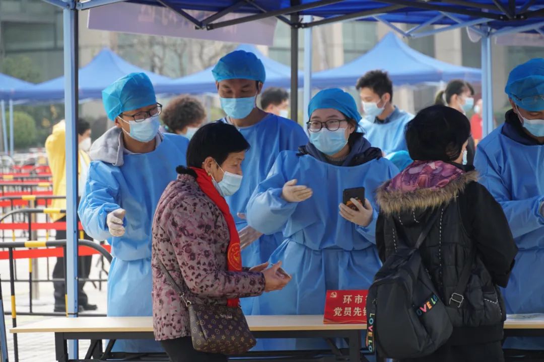 在东湖广场采样点,医护人员趁着休息间隙,舞动身体缓解疲劳,并相互拍照纪念。抗疫一线 党(团)旗始终飘扬