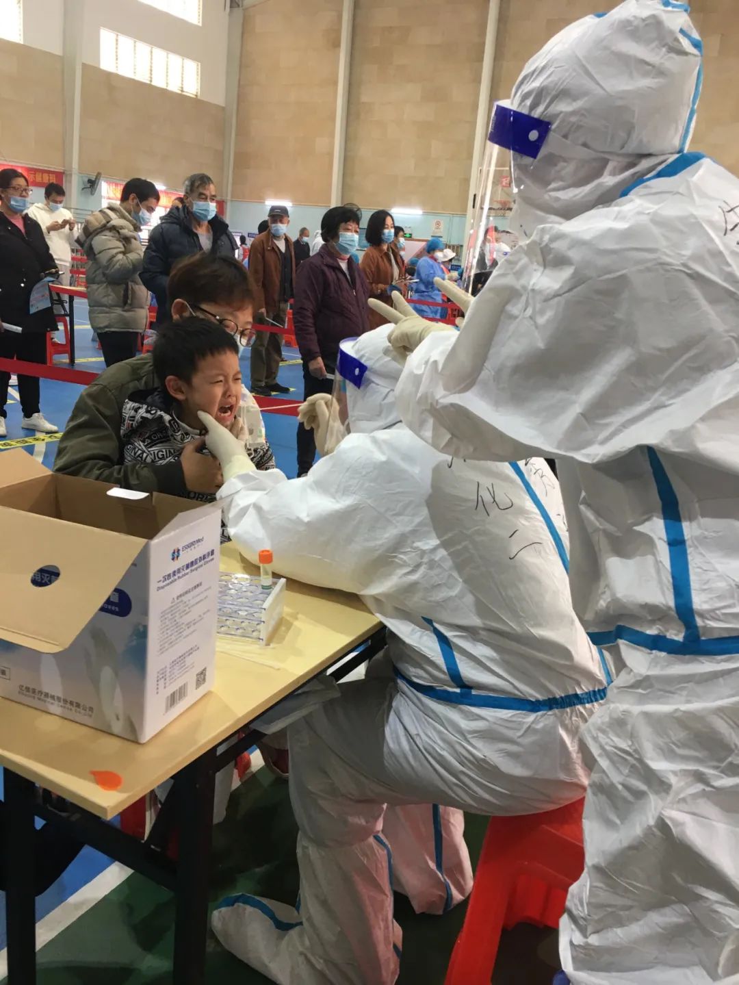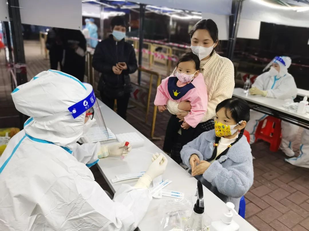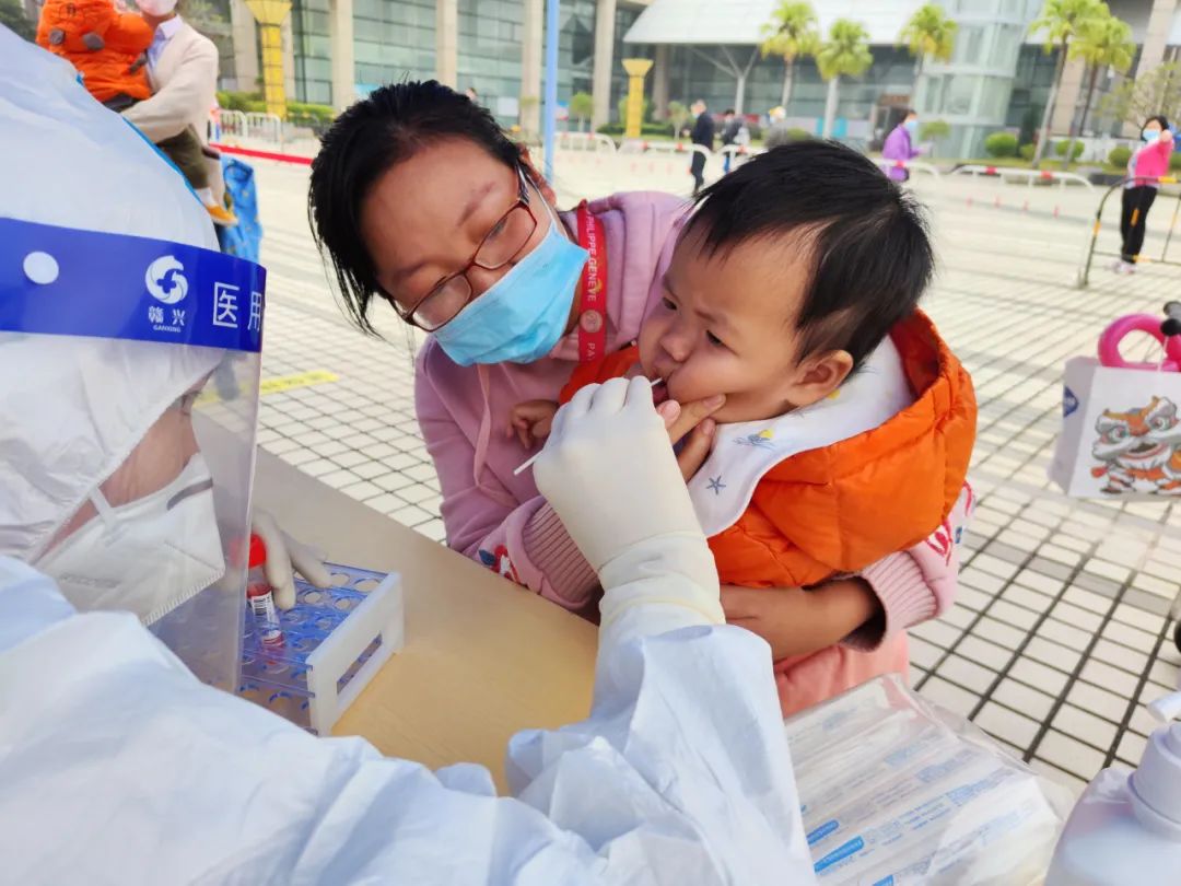 我还小但我很坚强。在五邑华侨广场采样点,小朋友在家长和医护人员的协助下完成采样。