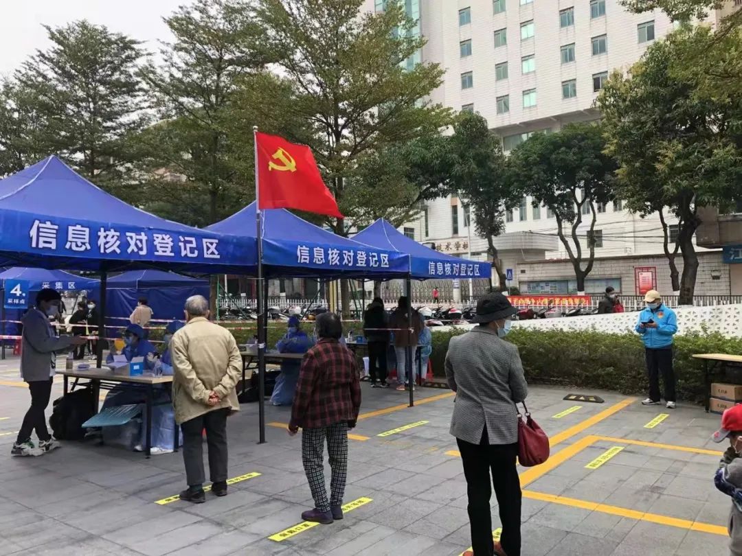 在华侨广场检测点,现场开辟了专门的老人通道,环市街道的党员先锋岗志愿者们为老人做指引。郭永乐 摄