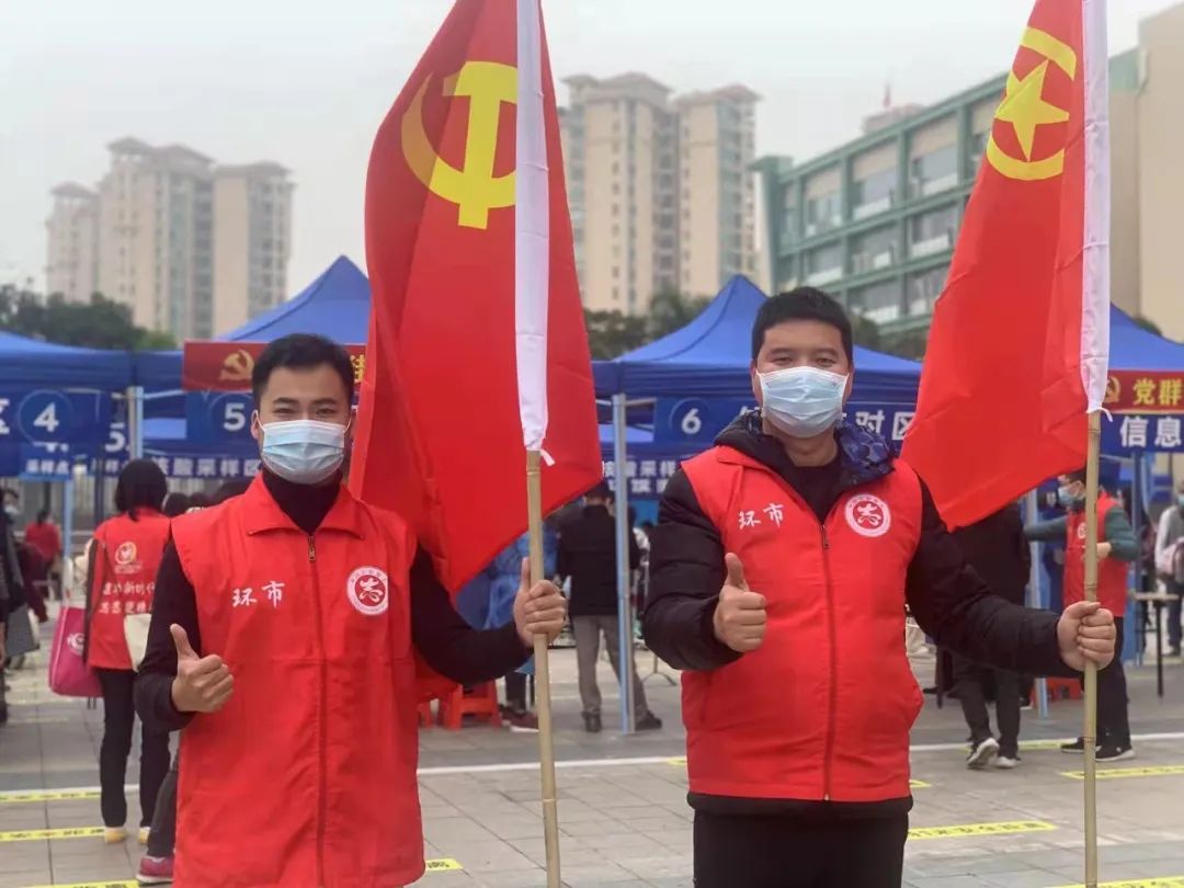 在环市街龙溪社区义乌采样点,党旗和团期齐飘扬。