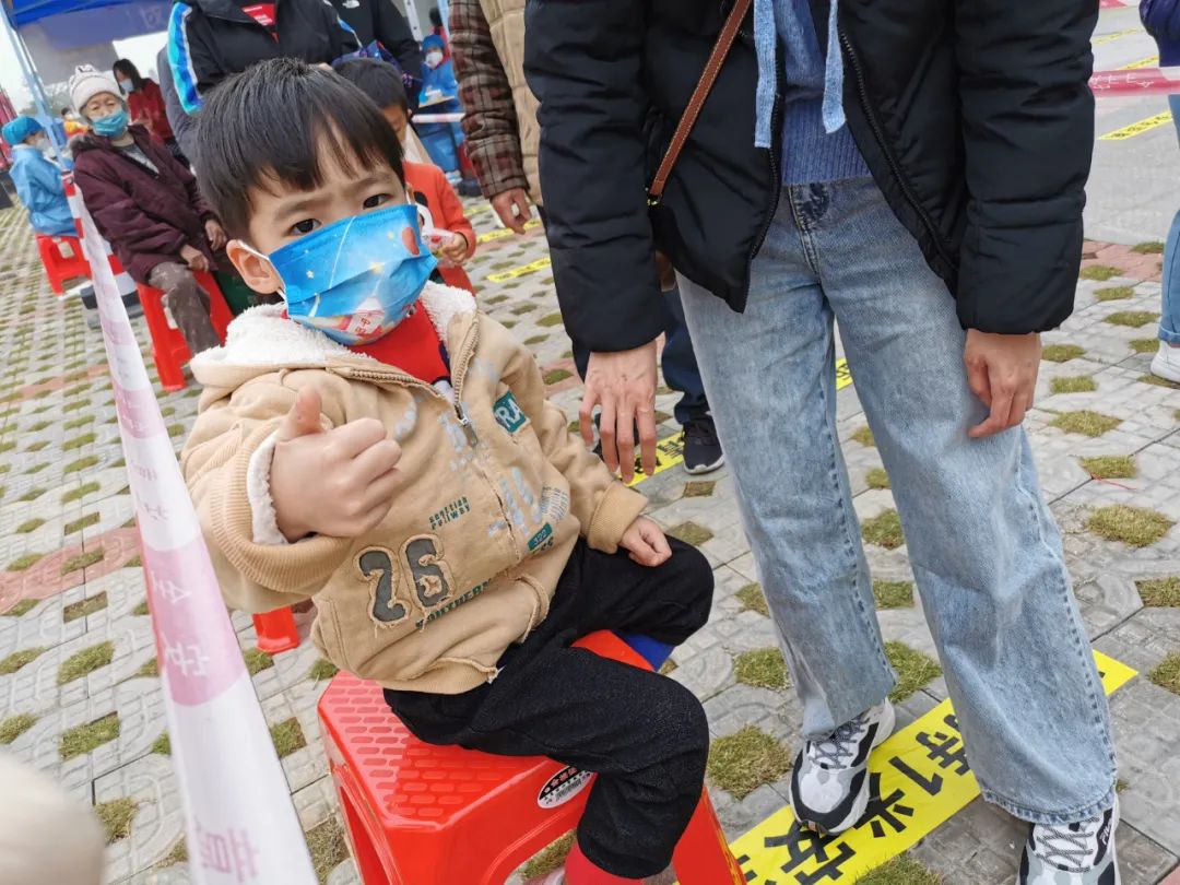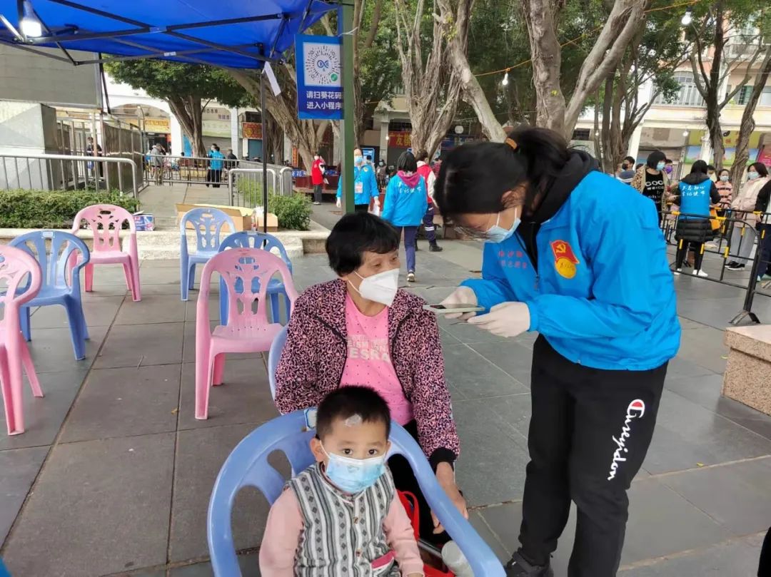 白沙街道良化西文体广场采样点,志愿者为前来做核酸检测的老人家提供暖心服务。勇敢萌娃测核酸