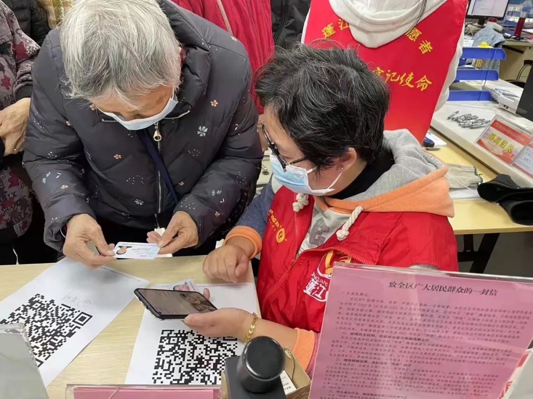 在环市街好景社区春华苑广场采样点,党员志愿者帮助老年群众录入个人信息。