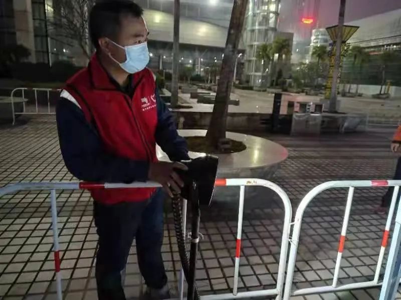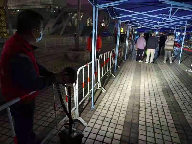在五邑华侨广场采样点,南方电网党员志愿者带来照明灯,调试安置在绿色通道,方便老年人和小朋友进场采样。