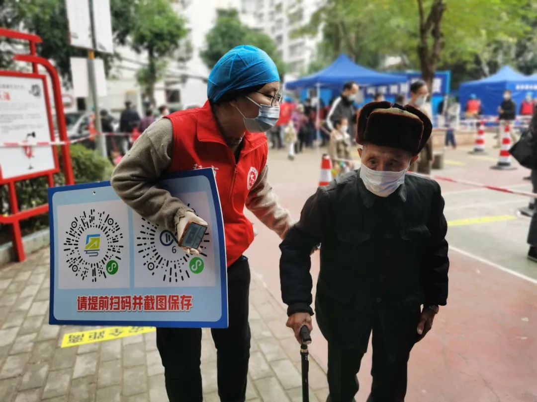 在环市街天龙社区文体广场采样点,志愿者指引长者就近坐下,并耐心帮他们录好信息形成核酸码。