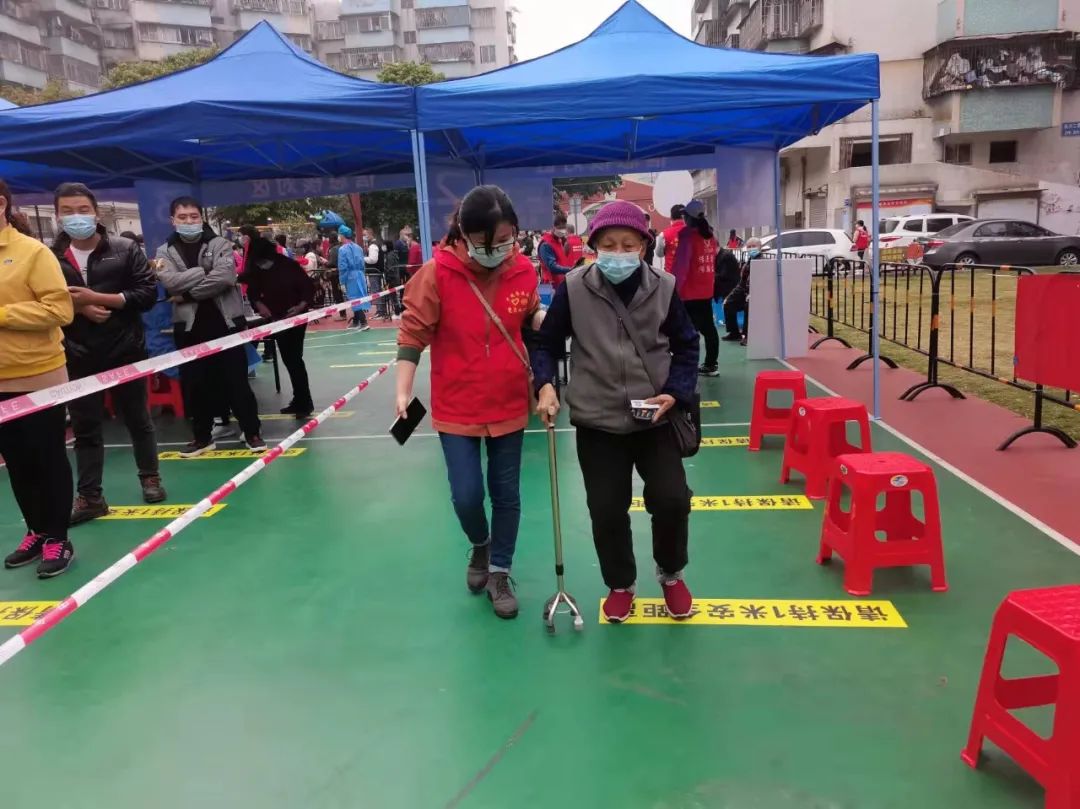 在环市街丽苑社区采样点,志愿者细心搀扶着90多岁的婆婆通过绿色通道,婆婆说:“我还能行,能自己下楼做核酸检测!感谢党和政府的关怀!”