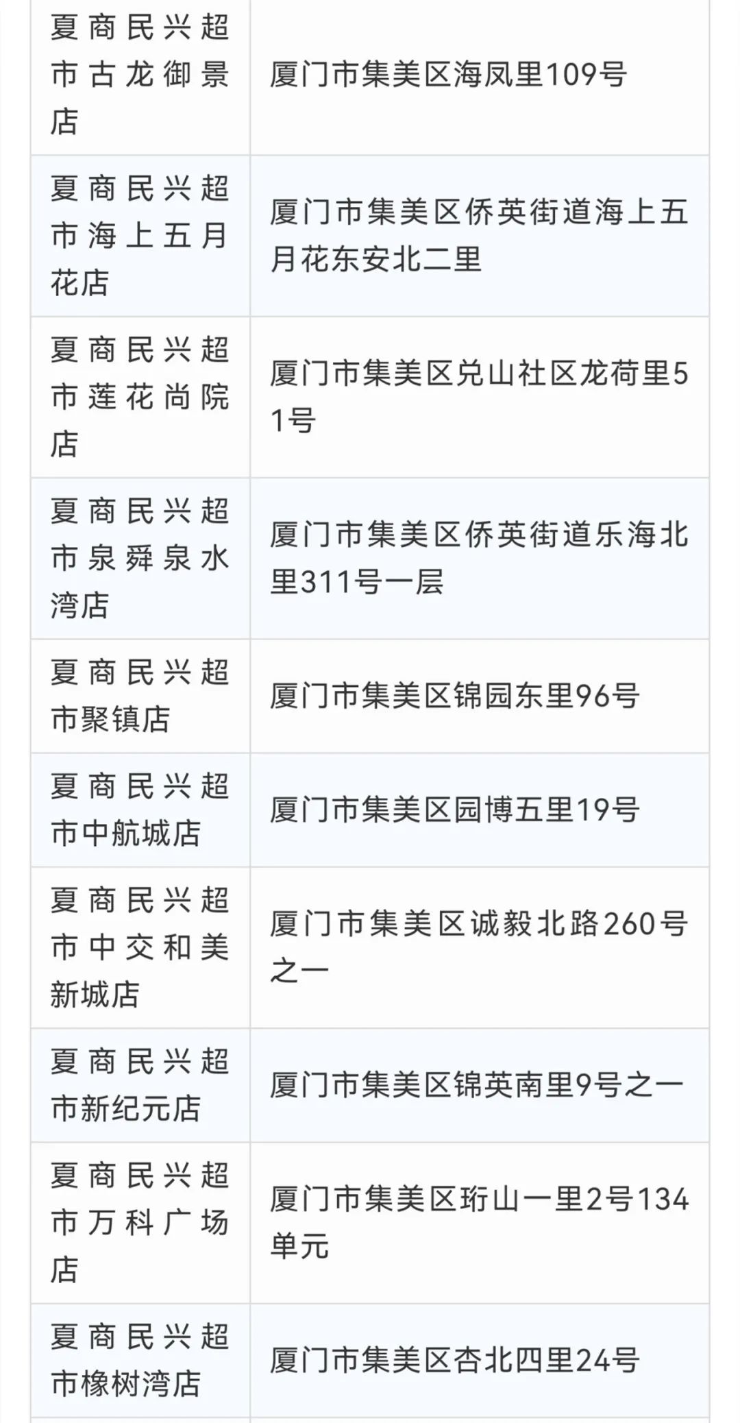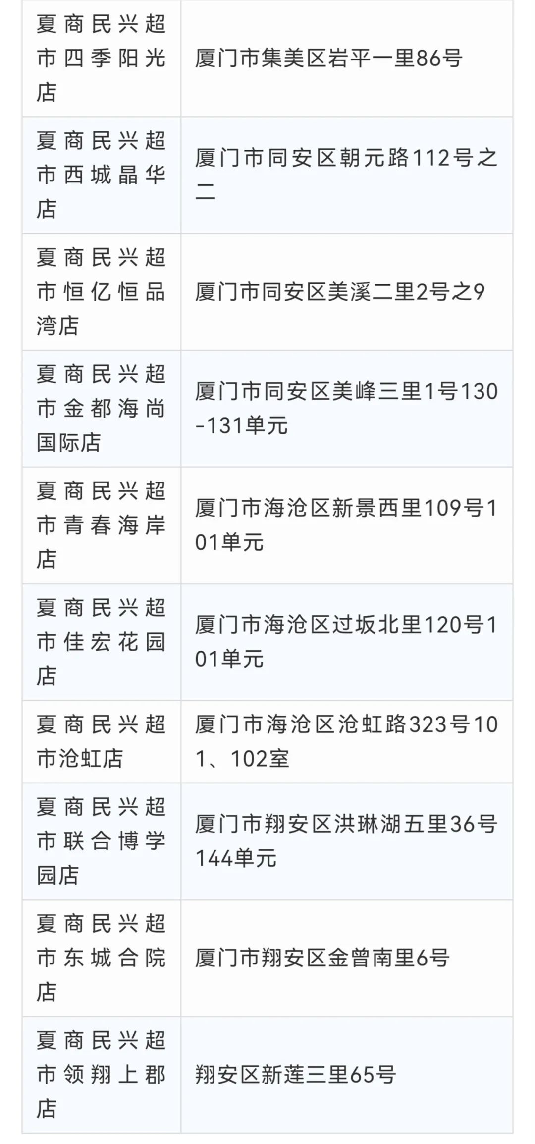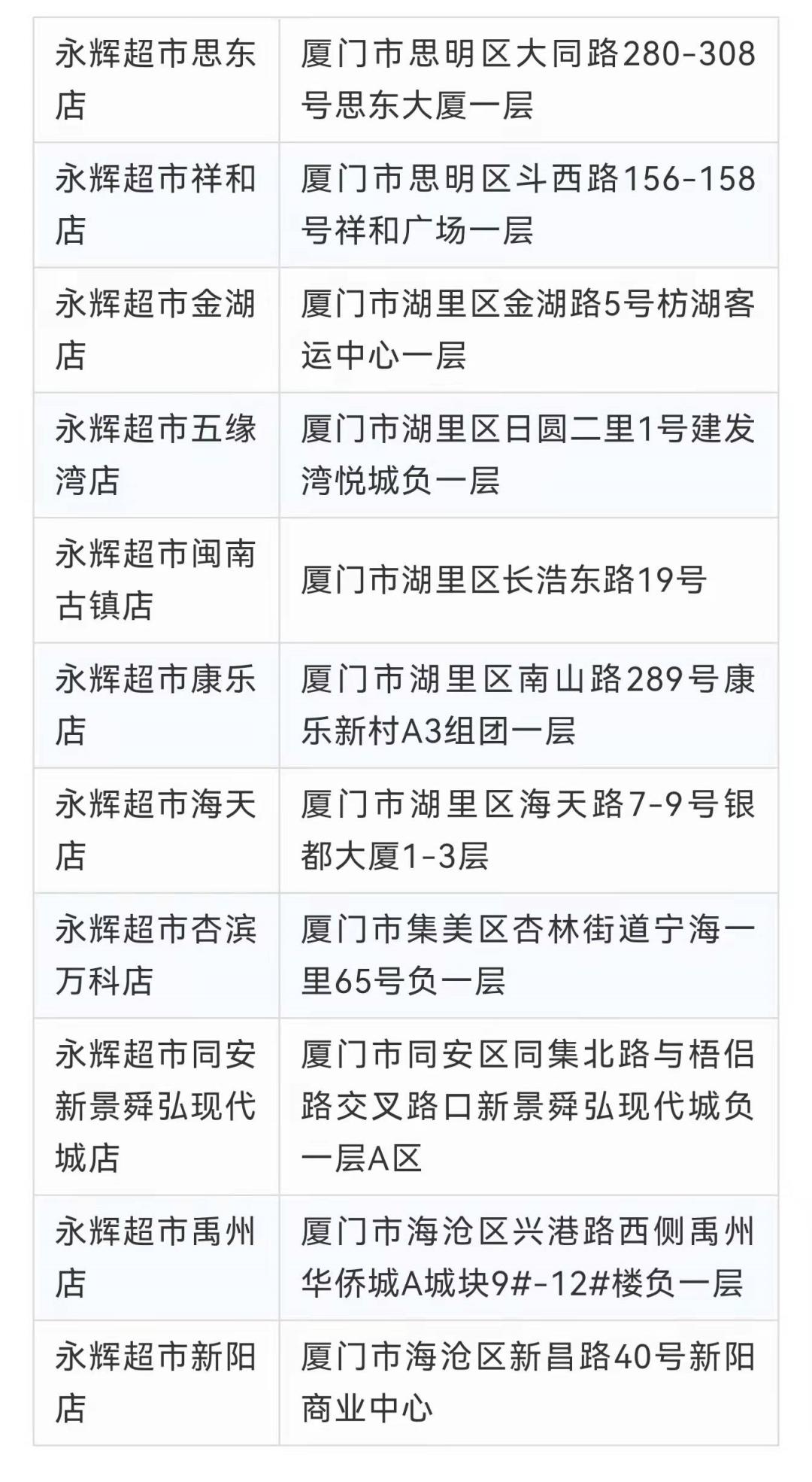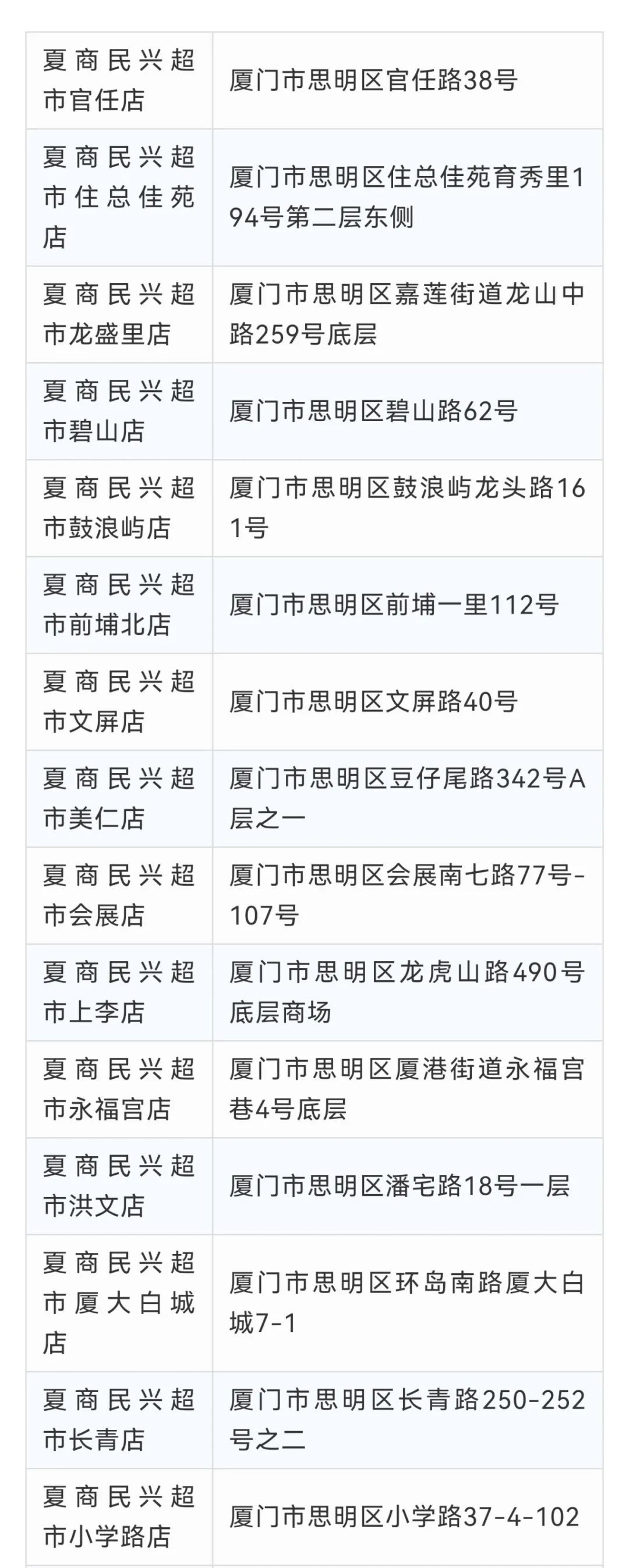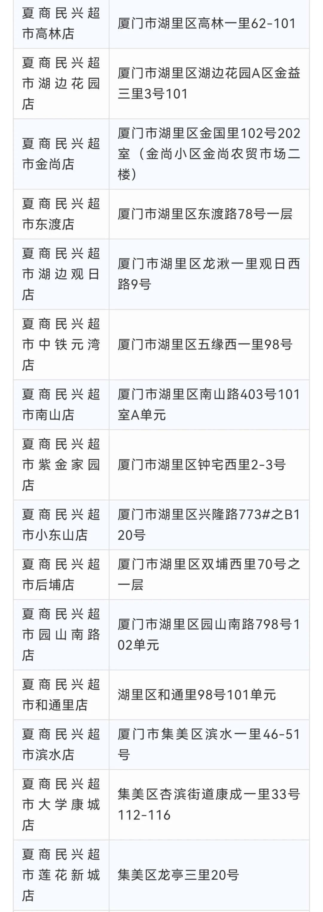闽篮超市禾祥店厦门市思明区后埭溪路109号银龙广场闽篮超市松柏店厦门市思明区屿后南里107-109号闽篮超市湖里店厦门市湖里区嘉园路26号闽篮超市杏林店厦门市集美区杏林杏东路宁海二里4号闽篮超市嵩屿店厦门市海沧区嵩屿北5里17号闽篮超市(云樽店)海沧区嵩屿南里144-148号闽篮超市黎安店厦门市翔安区马巷镇印斗山东路7号101闽篮超市洋唐店厦门市翔安区鼓罗一里61号闽篮超市(翔安溪尾一里店)翔安区溪尾一里20号101-107