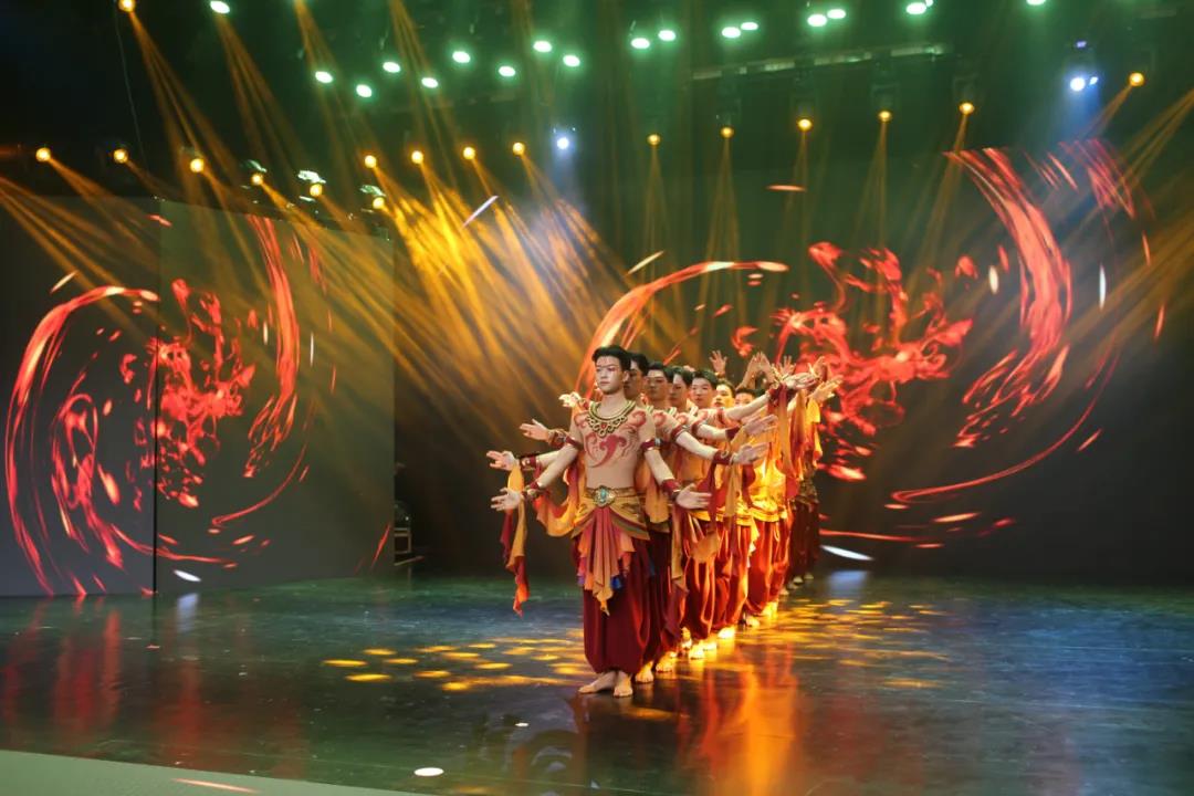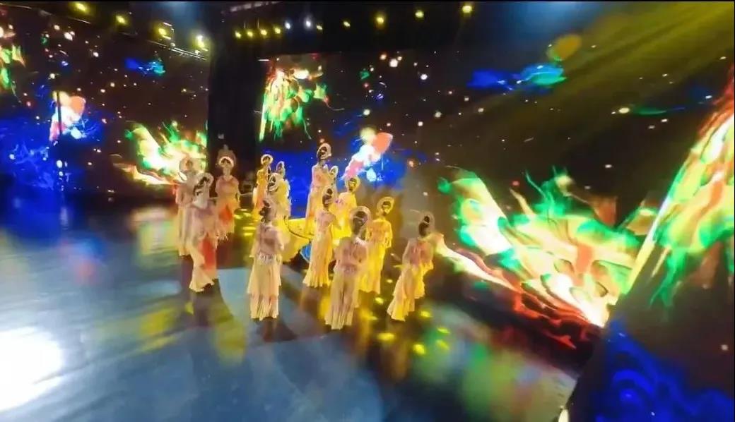 录制现场,在敦煌壁画的舞美背景下,30名演员身着古典华服翩翩起舞,化身敦煌壁画中的飞天和金刚力士,衣裙飘曳、舞姿婀娜,一颦一笑尽显东方神韵,在绚丽灯光和舞台背景的映衬下极具感染力。