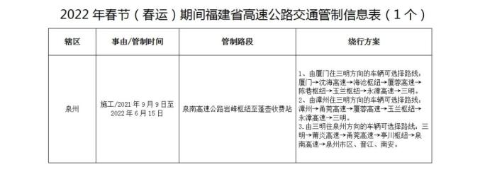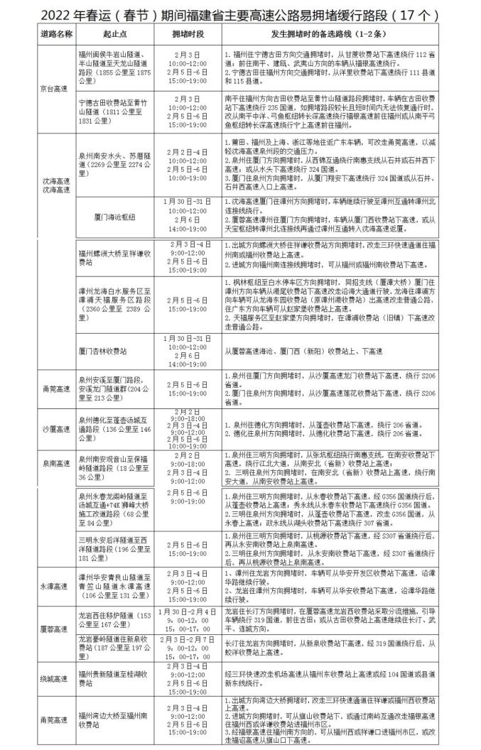 2022年春运时间为1月17日至2月25日结束,为期40天。春节假期为1月31日至2月6日,据预测,今年我省高速公路车流量表现为节前客流相对分散,节后返程较为集中。受疫情影响,预计营运客流将向自驾出行转移,加之重点时段集中出行,以及雨雾等恶劣天气,将对出行安全带来不利影响。福建公安交警提示,请提前规划好出行时间、路段和方式,做到“三避开”,即避开高峰时段、避开热门线路、避开拥堵节点。