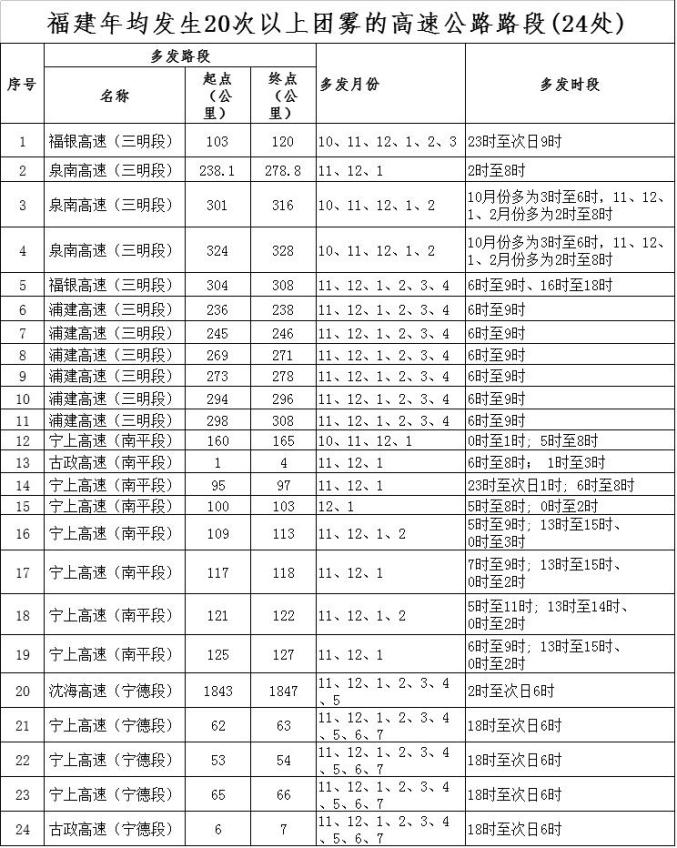 3.福银高速尤溪、泰宁段,泉南高速清流、宁化段,浦武高速泰宁、建宁等路段易出现霜冻、结冰、大雾等天气,请驾驶人尽量避开夜间、凌晨等时段出行。