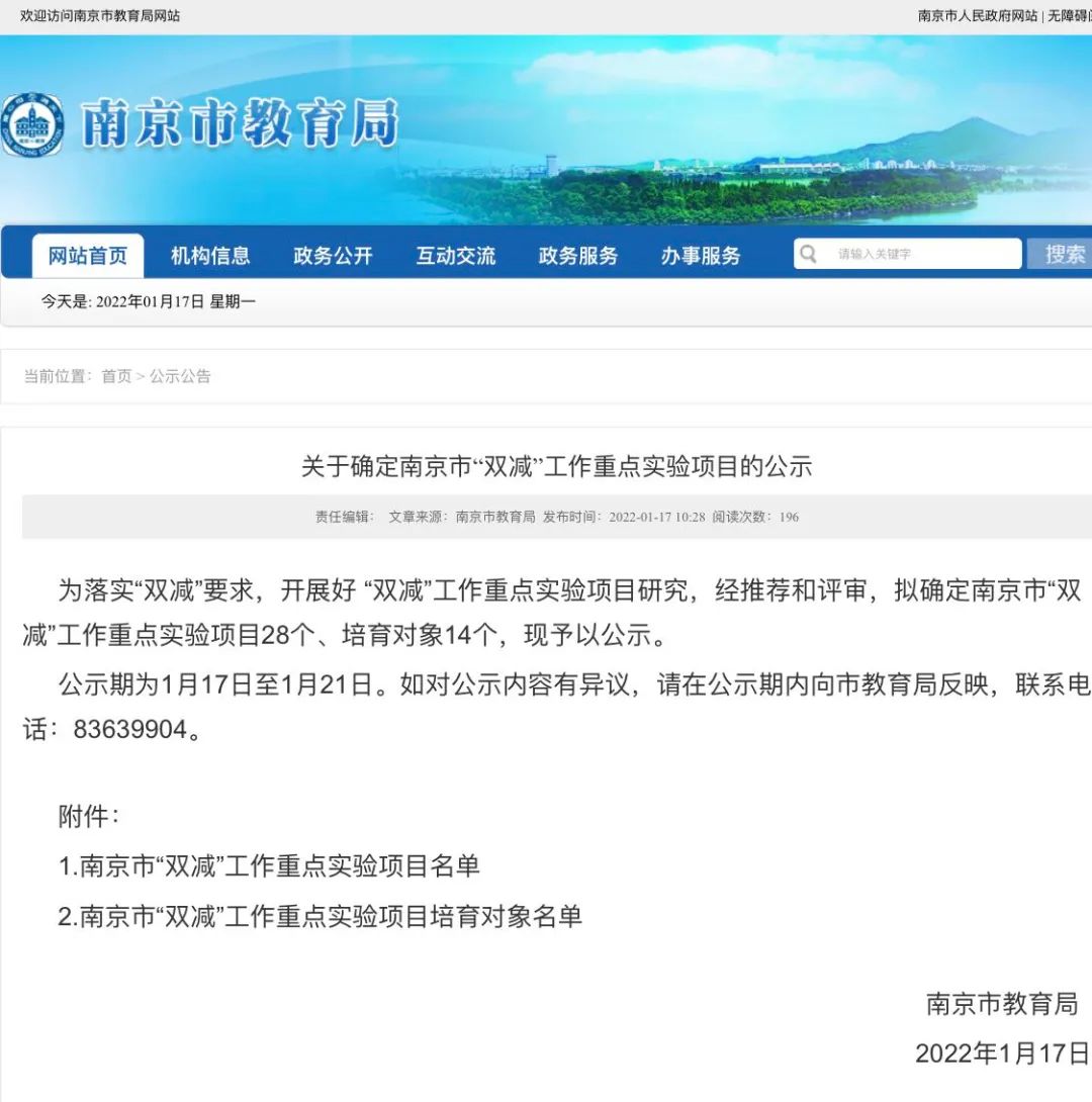 1月17日,南京市教育局官网发布《关于确定南京市“双减”工作重点实验项目的公示》。