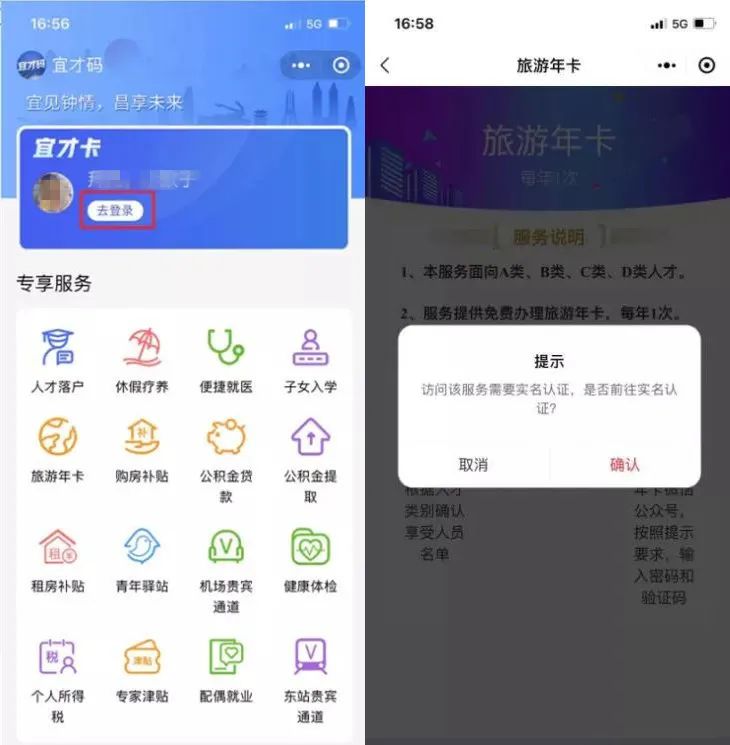 点击“去登录”按钮,进入实名认证页面(或者点击进入专享服务详情,提示请去实名认证点击确认,进入实名认证流程)