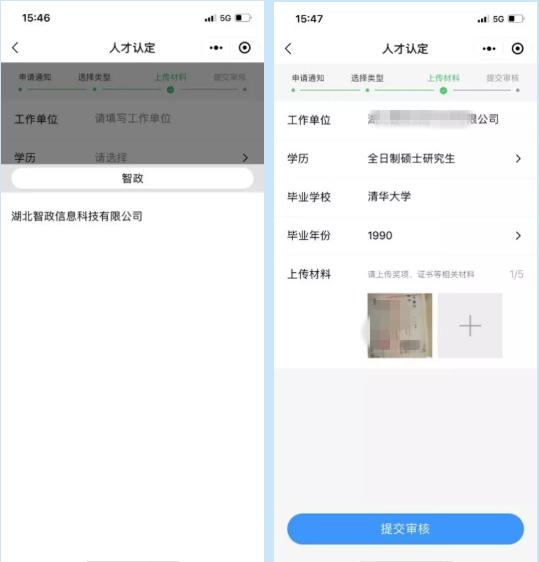 3.输入您的工作单位、学历、毕业学校、毕业年份以及相关材料,点击“提交审核”(工作单位输入框采用的是模糊查询,您只需要输入单位关键字,点击选择查找出来的结果项里面与您单位符合的项。针对个别单位无法查找的问题,目前正在协调相关单位核实处理。)