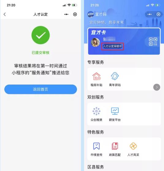 4.人才认定提交成功,提示已提交审核,可点击“返回首页”,首页状态会显示“人才认定审核中”。如您认定成功,就可以开始享受您的专享服务了。如您认定失败,可以再次发起人才认定,步骤同上。
