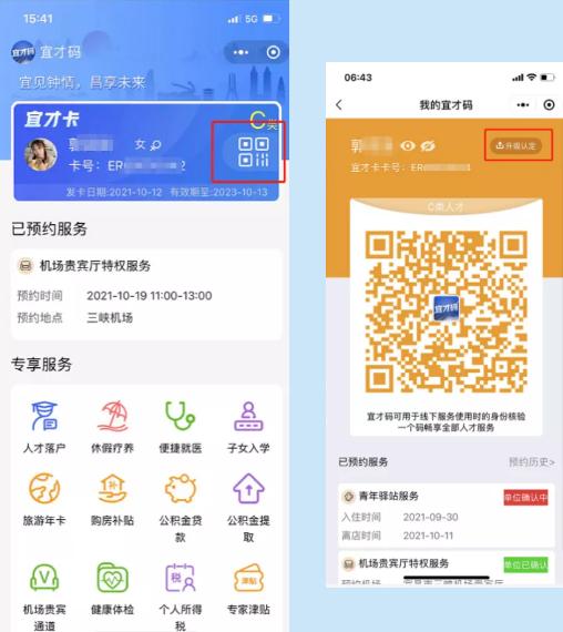 5.已认定成功的人才,首页展示您的卡号有效期以及人才类别。您也可以升级您的人才等级:点击您的宜才码,进入我的宜才码页面,点击“升级认定”,认定流程同上。