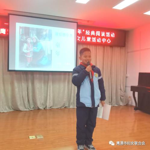 为了鼓励少年儿童养成阅读习惯,阅读整本的书,阅读经典之作,营造良好的家庭阅读氛围,鹰潭市妇联策划了一系列经典阅读活动。2022年1月17日在市妇女儿童活动中心举行了首场活动,孩子们围绕苏联作家高尔基的自传体小说《童年》,做了主题为“共读《童年》,畅享童年”的整本书阅读汇报展演,市妇联副主席黄小红亲临现场。鹰潭市一小陈珍老师带领四十多名活动中心孩子和家长共同参与了这次活动。