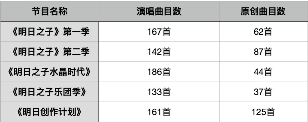 而“明日”系列从一开始就很注重原创音乐的创作,这也为哇唧唧哇后来强化在音乐领域的布局打下了基础。数据显示,从第一季的62首、第二季87首到第三季44首、第四季37首,再到第五季的《明日创作计划》的125首,五年来光是“明日”舞台上诞生的原创曲目就有355首。