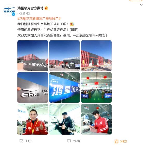 2022年1月3日,鸿星尔克的新疆于田服装生产基地也正式投产开工。据悉,该基地将实现120条生产线全面投产,落实4000个就业岗位。