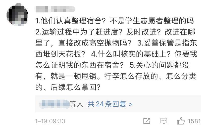 受疫情和放假影响,天津财经大学珠江学院的同学们大多已不在校园。搁置在寝室的行李,成了他们最牵挂的物品。因疫情防控要求,学校帮忙打包搬运学生物品无可厚非,同学们也能对此表示理解和支持。