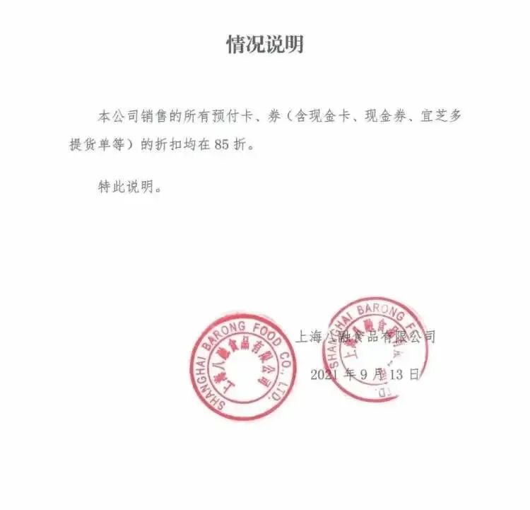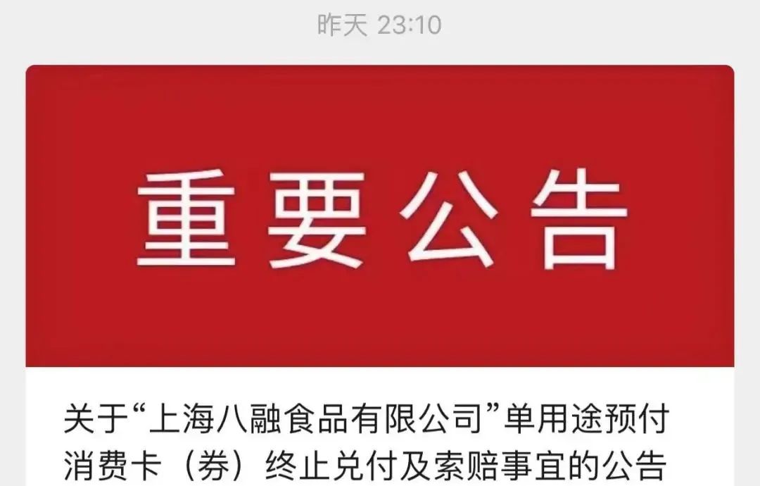 16日晚11点,宜芝多官方微信号发布了《关于“上海八融食品有限公司”单用途预付消费卡(券)终止兑付及索赔事宜的公告》