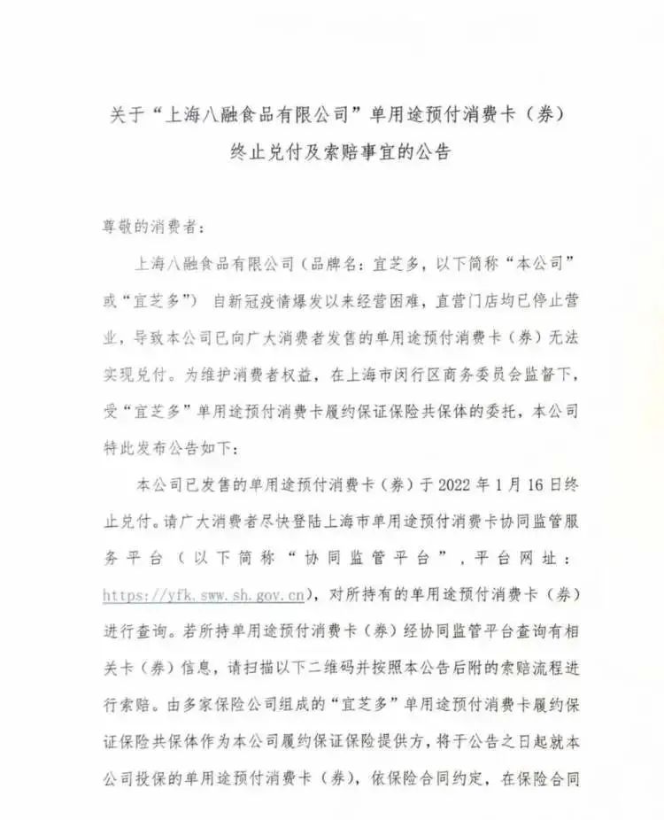 《公告》中指出,宜芝多直营门店均已停止营业,已发放的单用途预付卡券无法实现兑换,卡券已于1月16日终止兑付。请仍持有预付卡卡券的消费者登陆上海市单用途预付卡协同监管服务平台查询所持有的单用途预付卡券余额,然后进入索赔流程进行索赔。宜芝多将在保险合同责任范围内承担保险责任。