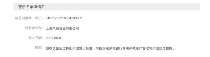 宜芝多又传出关门的消息。记者还查询到,在上海市商务委的“上海市单用途预付消费卡协同监管服务平台”上八融公司在2021年6月1日被列入“警示名单”,原因是“预收资金超过特别风险警示标准未按规定采取银行专用存款账户管理等风险防范措施。”商务部门、市场监管部门已对此事介入调查,对相关负责人进行约谈。