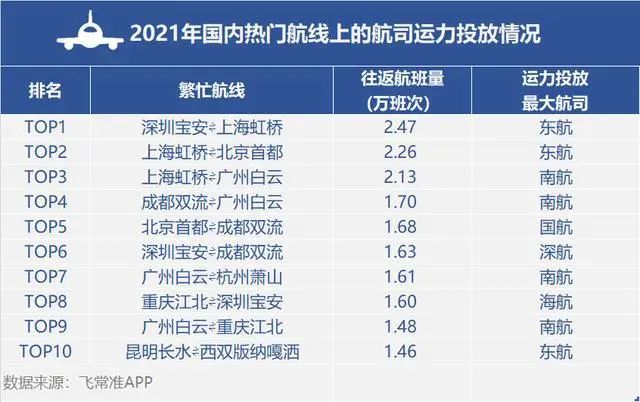 统计显示,2021年我国内地航班稳步恢复,航线日均执行航班量约为1.03万班次,同比提高9.69%。年度最繁忙航线为深圳宝安往返上海虹桥,往返航班量为2.47万班次,该条航线相比2020年,实际执飞航班量增加了800余班次。
