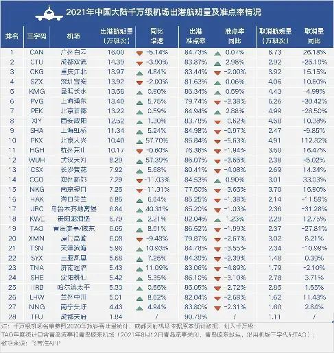 《报告》显示,2021年中国内地机场实际出港航班量约为382万班次,平均出港准点率为82.96%。千万级机场年度榜单中,广州白云机场出港航班量最多,为16.00万班次,这是继2020年后再次成为年度最繁忙机场。而紧随其后的是成都双流机场,出港航班量为14.39万班次,成为仅次广州白云的第二大最为繁忙机场。