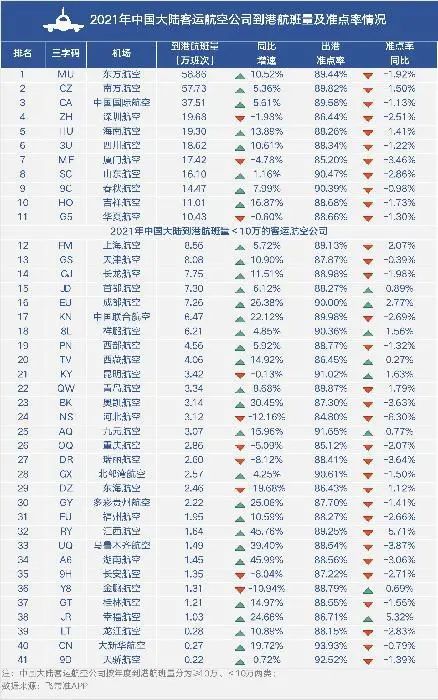 据了解,2021年41家中国内地客运航空公司中,31家航司航班量实现同比正增长。11家航司年度到港航班量超过10万班次,其中东方航空年度到港航班量最多,为58.86万班次;相比2020年同期,吉祥航空航班量同比增速最快,同比增长16.87%。山东航空、春秋航空准点率相对较高,到港准点率高达90%以上。