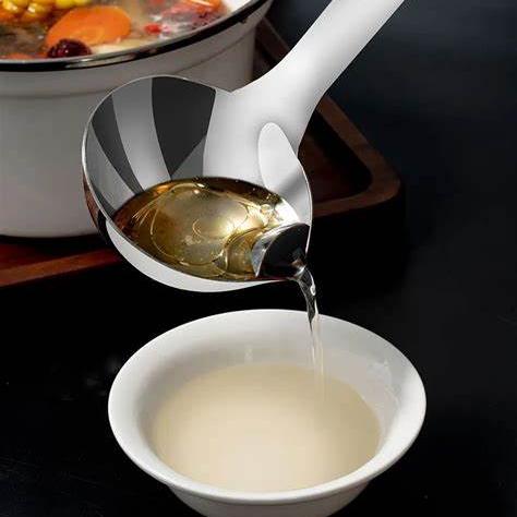 这种方式虽然有效,但却相对原始。目前市面上有一种神器——油水分离勺,由于食用油的密度比水小,在油水混合物中油始终在上层、水在下层,油水分离勺就是利用重力沉降原理去除杂质和水分,在勺子设计中叠加两层,大勺中有个过滤小勺,因此水分排出的同时保证油脂留在了勺子表层,这种科技的进步正在不断便利我们的生活。