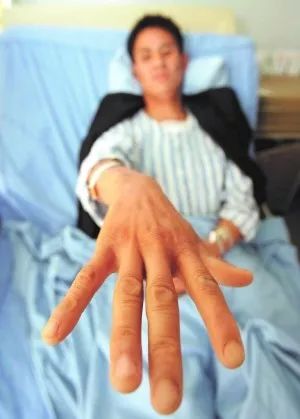 (2)拇指征:令患者拇指内收,横置于掌心伸直并握拳。如果伸展的拇指明显超出该手尺侧缘,则为阳性。