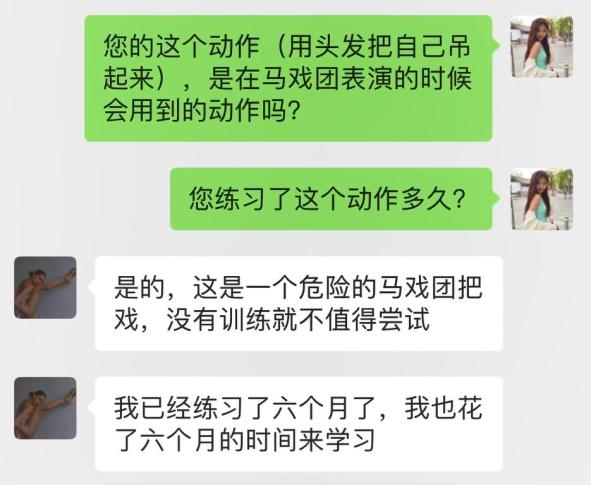 她通过高难度杂技节目“吊小辫”