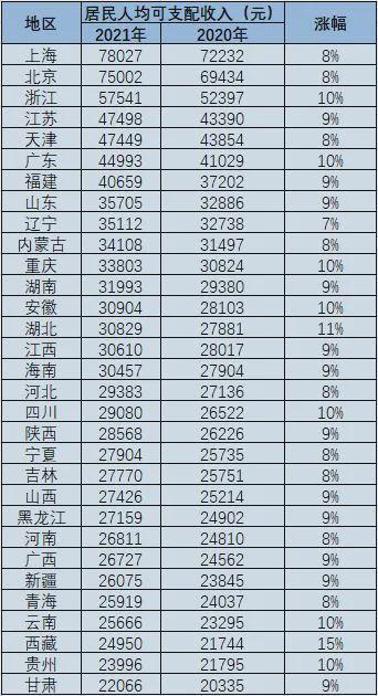 31省份2021年居民人均可支配收入数据。数据来源:国家统计局人均可支配收入榜