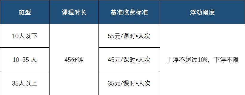 2022年1月11日开始,温州市义务教育阶段线下学科类校外培训收费执行政府指导价,发改部门已明确收费标准。学科类培训机构在基准收费标准和浮动幅度内,确定具体收费标准。45分钟为标准课程时长,实际时长不一样的,按比例折算。具体标准如下: